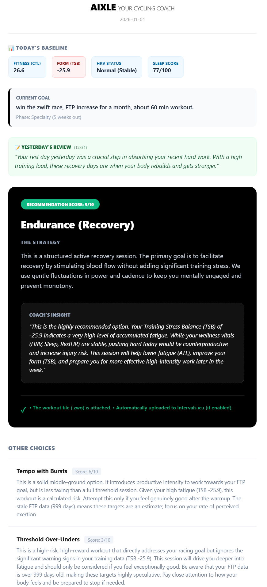 Stop guessing. We analyze both your training load and your biological response (HRV, Sleep, Fatigue) from Intervals.icu. Get 3 strategic workout options every morning with clear coaching reasons.
